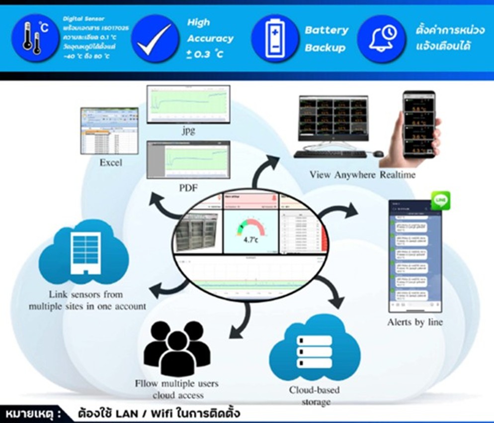 - เป็นอุปกรณ์วัดและบันทึกอุณหภูมิพร้อมแสดงผลและแจ้งเตือนผ่านระบบ Cloud